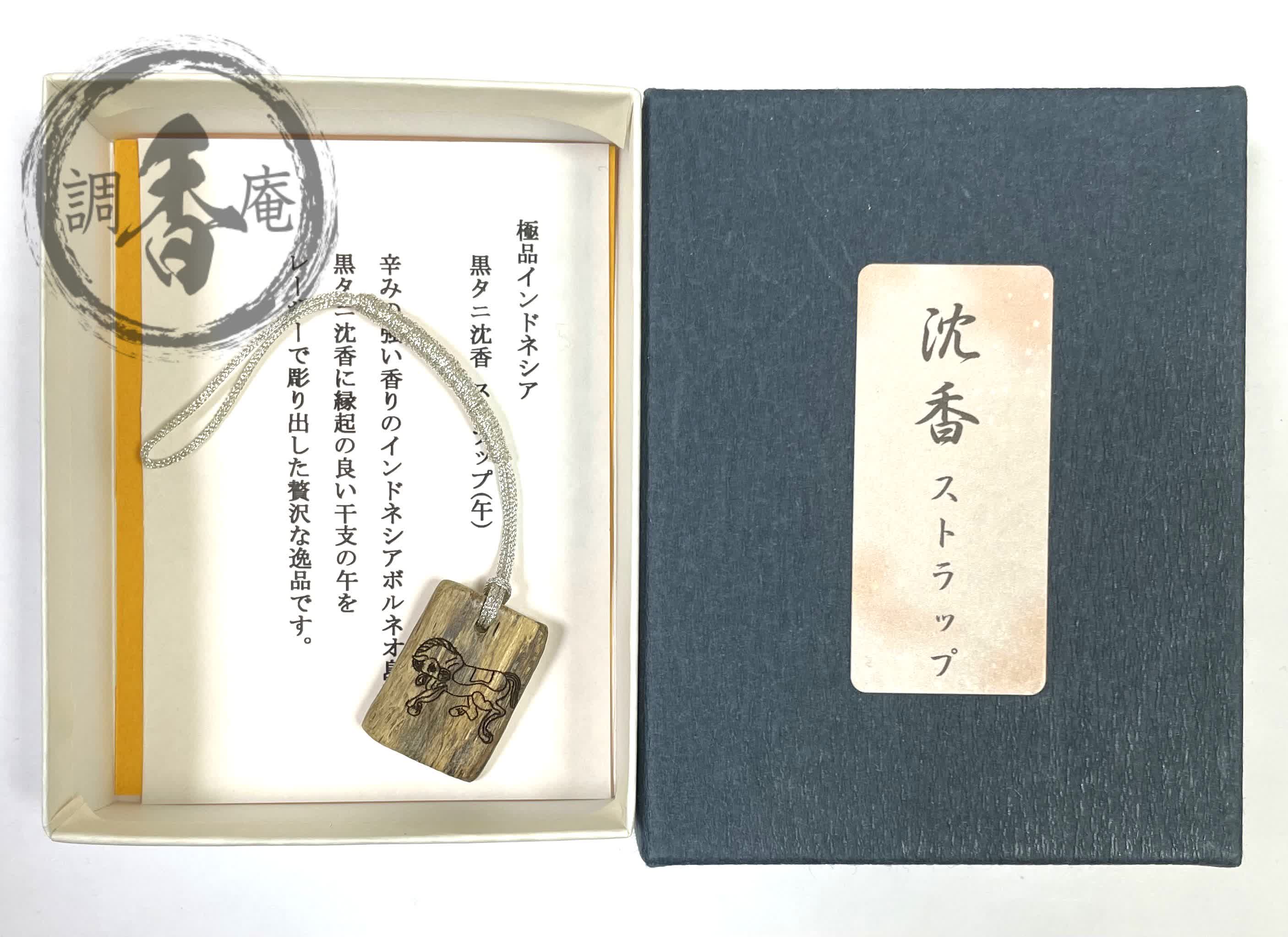 辛味の香りが特に素晴らしい極上タニ沈香「黒タニ」をそのまま用いて贅沢なストラップを作りました。黒タニの中央部分に本年の干支・午をレーザー彫りした限定品でございます。